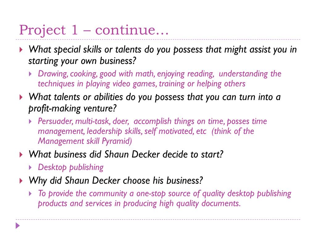 Project 1 – continue… • What special skills or talents do you possess that might assist you in starting your own business? • Drawing, cooking, good with math, enjoying reading, understanding the techniques in playing video games, training or helping others • What talents or abilities do you possess that you can turn into a profit-making venture? • Persuader, multi-task, doer, accomplish things on time, posses time management, leadership skills, self motivated, etc (think of the Management skill Pyramid) • What business did Shaun Decker decide to start? • Desktop publishing • Why did Shaun Decker choose his business? • To provide the community a one-stop source of quality desktop publishing products and services in producing high quality documents.