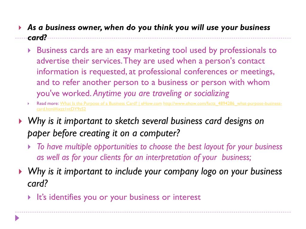 As a business owner, when do you think you will use your business card? • Business cards are an easy marketing tool used by professionals to advertise their services. They are used when a person's contact information is requested, at professional conferences or meetings, and to refer another person to a business or person with whom you've worked. Anytime you are traveling or socializing • Read more: What Is the Purpose of a Business Card? | eHow.comhttp://www.ehow.com/facts_4894286_what-purpose-business-card.html#ixzz1ntDY9zS2 • Why is it important to sketch several business card designs on paper before creating it on a computer? • To have multiple opportunities to choose the best layout for your business as well as for your clients for an interpretation of your business; • Why is it important to include your company logo on your business card? • It’s identifies you or your business or interest