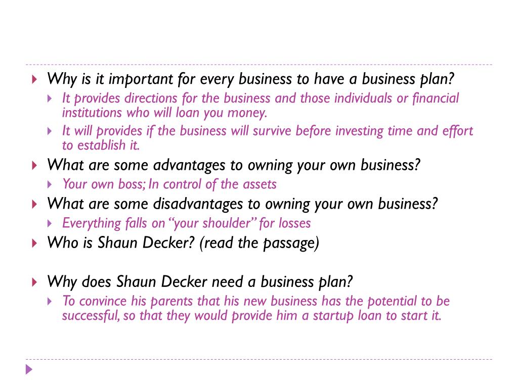 Why is it important for every business to have a business plan? • It provides directions for the business and those individuals or financial institutions who will loan you money. • It will provides if the business will survive before investing time and effort to establish it. • What are some advantages to owning your own business? • Your own boss; In control of the assets • What are some disadvantages to owning your own business? • Everything falls on “your shoulder” for losses • Who is Shaun Decker? (read the passage) • Why does Shaun Decker need a business plan? • To convince his parents that his new business has the potential to be successful, so that they would provide him a startup loan to start it.