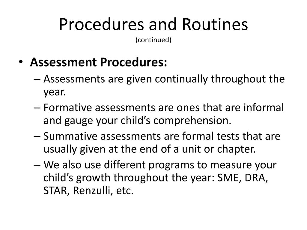 Procedures and Routines (continued) • Assessment Procedures: • Assessments are given continually throughout the year. • Formative assessments are ones that are informal and gauge your child’s comprehension. • Summative assessments are formal tests that are usually given at the end of a unit or chapter. • We also use different programs to measure your child’s growth throughout the year: SME, DRA, STAR, Renzulli, etc.