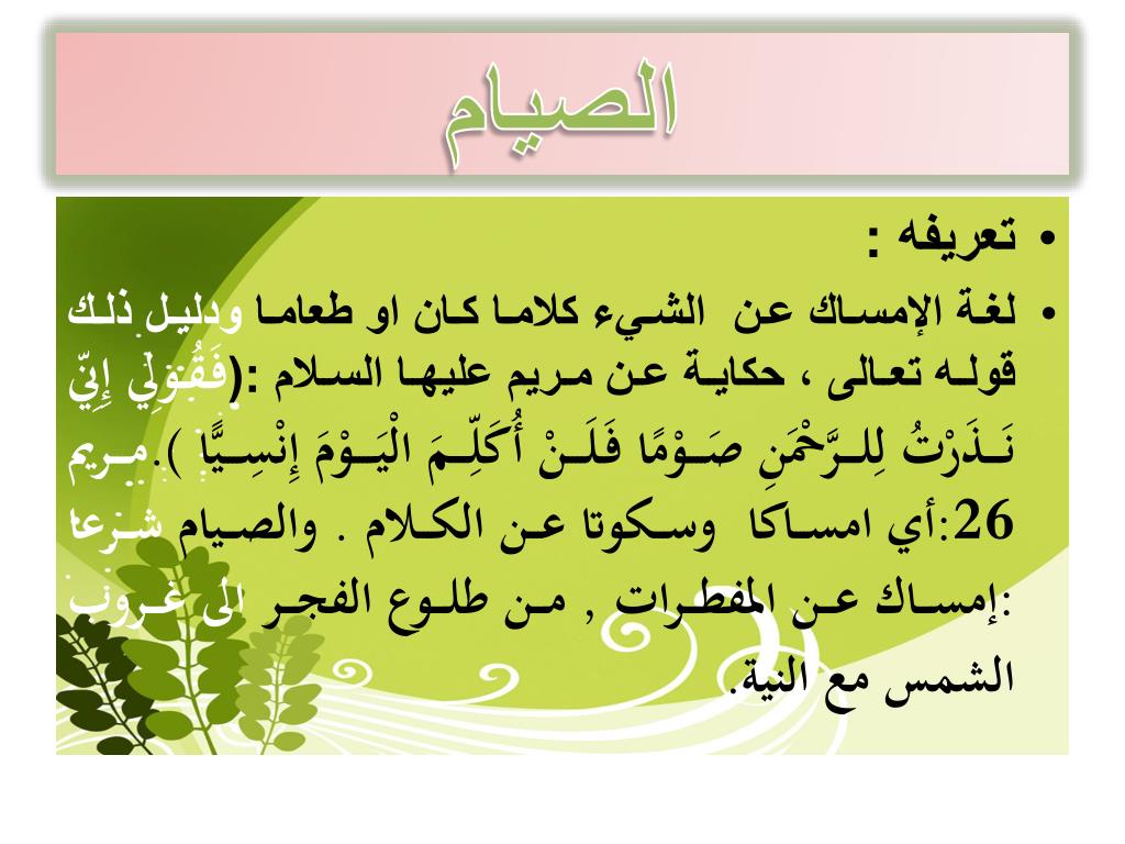 الصيام • تعريفه : • لغة الإمساك عن الشيء كلاما كان او طعاما ودليل ذلك قوله تعالى ، حكاية عن مريم عليها السلام :(فَقُولِي إِنِّي نَذَرْتُ لِلرَّحْمَنِ صَوْمًا فَلَنْ أُكَلِّمَ الْيَوْمَ إِنْسِيًّا ).مريم 26:أي امساكا وسكوتا عن الكلام . والصيام شرعا :إمساك عن المفطرات , من طلوع الفجر الى غروب الشمس مع النية.