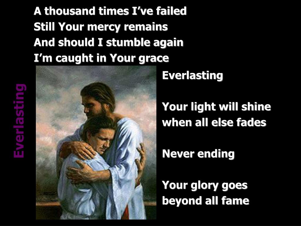 A thousand times I’ve failed • Still Your mercy remains • And should I stumble again • I’m caught in Your grace Everlasting Your light will shine when all else fades Never ending Your glory goes beyond all fame Everlasting