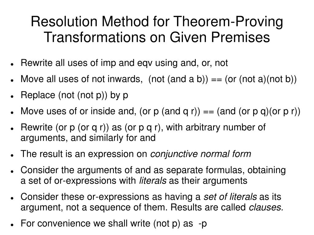 Resolution Method for Theorem-ProvingTransformations on Given Premises • Rewrite all uses of imp and eqv using and, or, not • Move all uses of not inwards, (not (and a b)) == (or (not a)(not b)) • Replace (not (not p)) by p • Move uses of or inside and, (or p (and q r)) == (and (or p q)(or p r)) • Rewrite (or p (or q r)) as (or p q r), with arbitrary number of arguments, and similarly for and • The result is an expression on conjunctive normal form • Consider the arguments of and as separate formulas, obtaining a set of or-expressions with literals as their arguments • Consider these or-expressions as having a set of literals as its argument, not a sequence of them. Results are called clauses. • For convenience we shall write (not p) as -p
