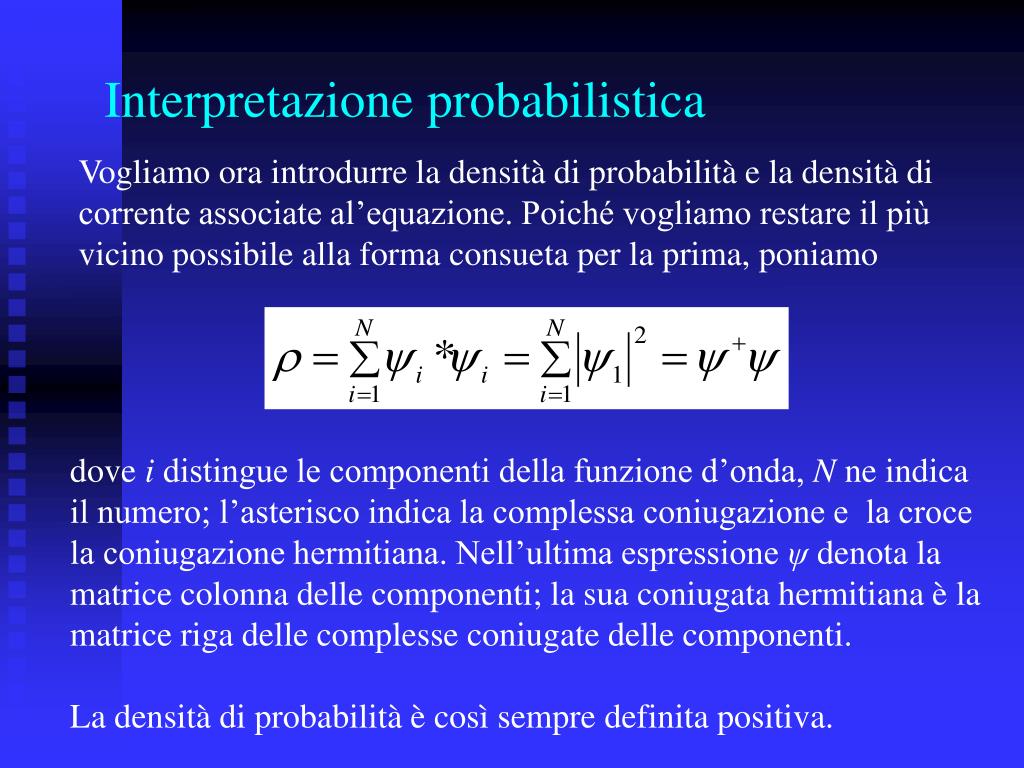 Interpretazione probabilistica Vogliamo ora introdurre la densità di probabilità e la densità di corrente associate al’equazione. Poiché vogliamo restare il più vicino possibile alla forma consueta per la prima, poniamo dove i distingue le componenti della funzione d’onda, N ne indica il numero; l’asterisco indica la complessa coniugazione e la croce la coniugazione hermitiana. Nell’ultima espressione ψ denota la matrice colonna delle componenti; la sua coniugata hermitiana è la matrice riga delle complesse coniugate delle componenti. La densità di probabilità è così sempre definita positiva.