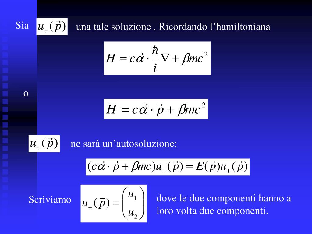 Con l’hamiltoniana di Dirac commuta invece la somma il cui secondo termine è l’operatore di spin nel caso di uno “spin ½”. L’equazione di Dirac non è la più generale ’equazione d’onda relativistica: essa descrive (relativisticamente) particelle di spin spin ½. Vogliamo vedere le cose più in dettaglio, soprattutto in relazione al fatto che, per la descrizione di una particella di spin 1/2, sembra bastare una funzione d’onda a due componenti.