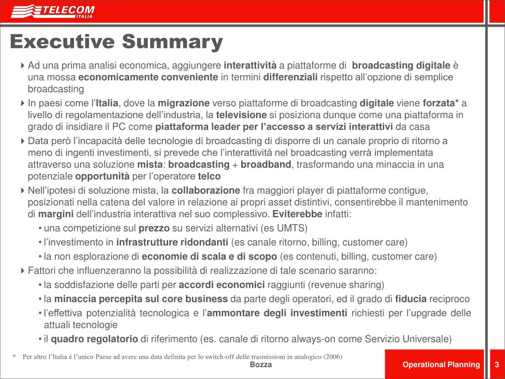 Agenda • Executive Summary • Introduzione • Piattaforme interattive nel contesto della convergenza media • Panorama odierno dei player digitali nel broadcasting televisivo • TV interattiva: opportunità di business • Servizi interattivi ed economics associati • Sintesi • Ulteriori considerazioni • Regolamentazione DTT • Allegati