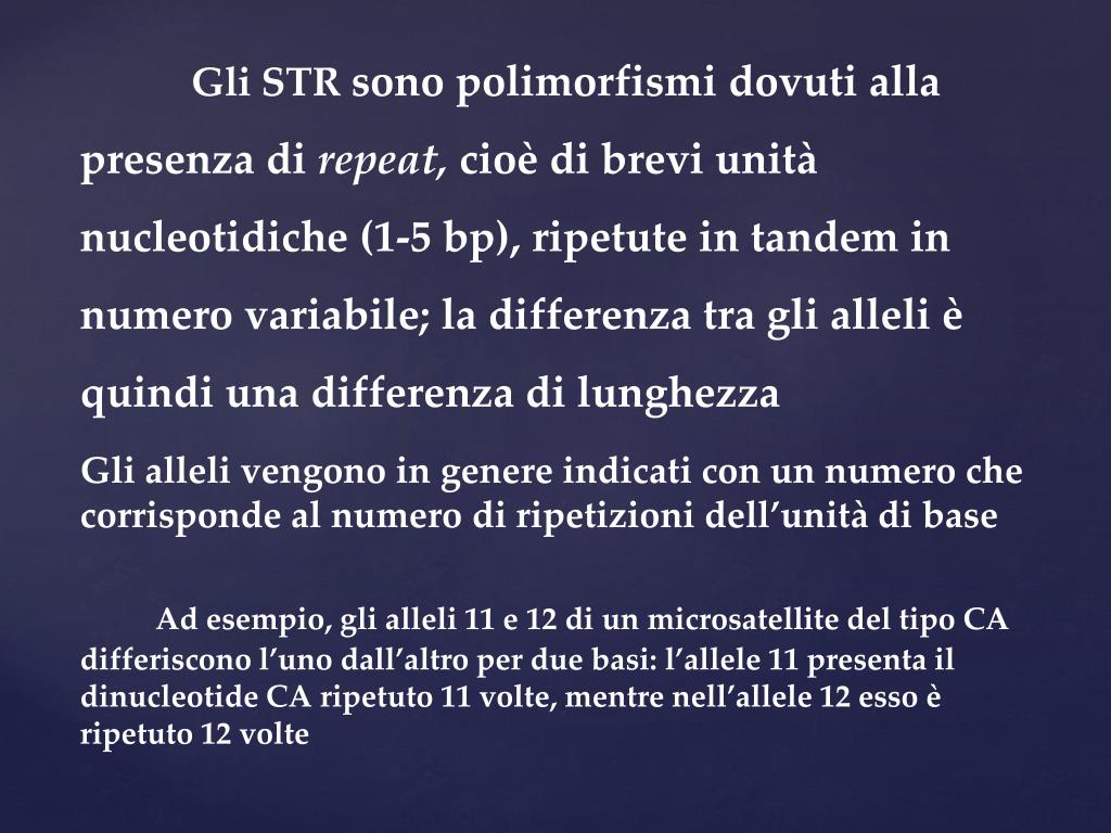 Gli STR sono polimorfismi dovuti alla presenza di repeat, cioè di brevi unità nucleotidiche (1-5 bp), ripetute in tandem in numero variabile; la differenza tra gli alleli è quindi una differenza di lunghezza Gli alleli vengono in genere indicati con un numero che corrisponde al numero di ripetizioni dell’unità di base Ad esempio, gli alleli 11 e 12 di un microsatellite del tipo CA differiscono l’uno dall’altro per due basi: l’allele 11 presenta il dinucleotide CA ripetuto 11 volte, mentre nell’allele 12 esso è ripetuto 12 volte