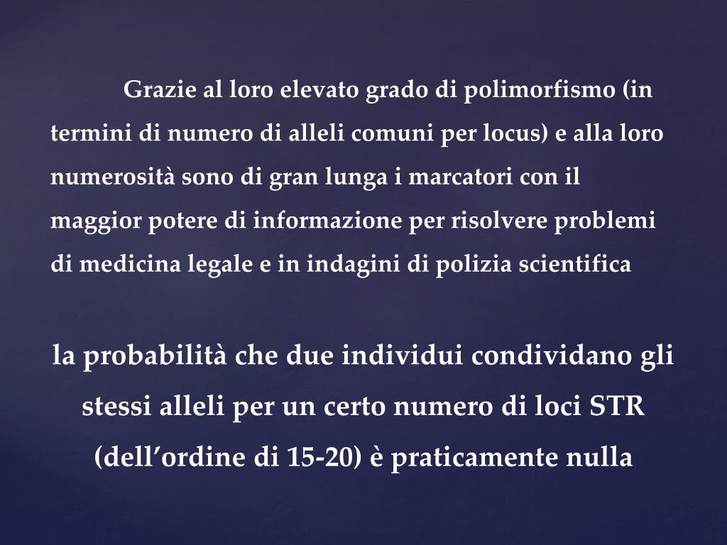 Grazie al loro elevato grado di polimorfismo (in termini di numero di alleli comuni per locus) e alla loro numerosità sono di gran lunga i marcatori con il maggior potere di informazione per risolvere problemi di medicina legale e in indagini di polizia scientifica la probabilità che due individui condividano gli stessi alleli per un certo numero di loci STR (dell’ordine di 15-20) è praticamente nulla