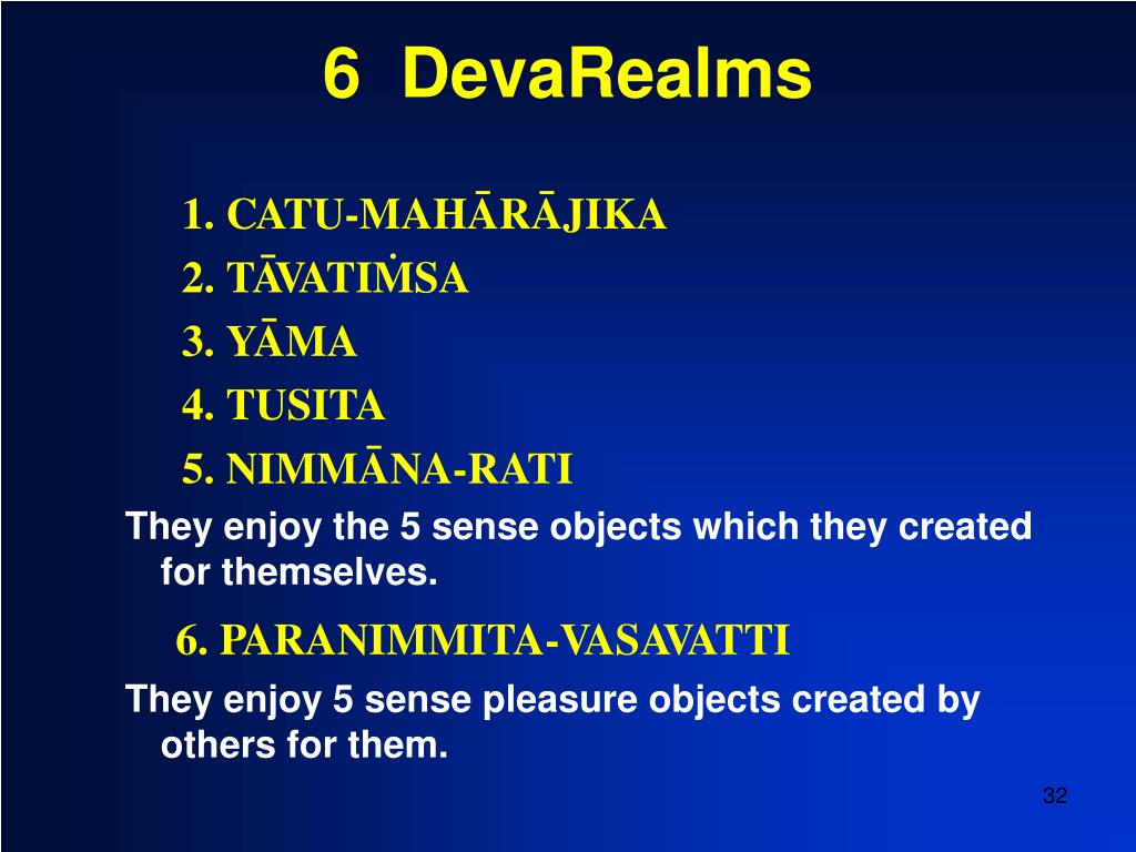 6 DevaRealms 1. CATU-MAHâRâJIKA 2.TâVATIÑSA 3. YâMA 4. TUSITA 5. NIMMâNA-RATI They enjoy the 5 sense objects which they created for themselves. 6. PARANIMMITA-VASAVATTI They enjoy 5 sense pleasure objects created by others for them.