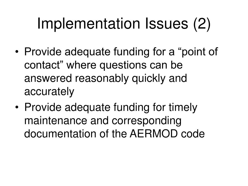 Implementation Issues (2) • Provide adequate funding for a “point of contact” where questions can be answered reasonably quickly and accurately • Provide adequate funding for timely maintenance and corresponding documentation of the AERMOD code
