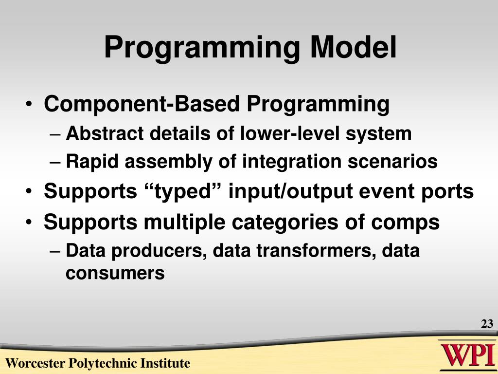 Programming Model • Component-Based Programming • Abstract details of lower-level system • Rapid assembly of integration scenarios • Supports “typed” input/output event ports • Supports multiple categories of comps • Data producers, data transformers, data consumers Worcester Polytechnic Institute