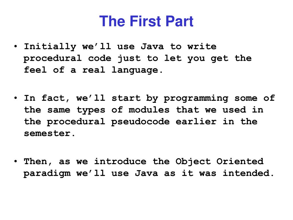 The First Part • Initially we’ll use Java to write procedural code just to let you get the feel of a real language. • In fact, we’ll start by programming some of the same types of modules that we used in the procedural pseudocode earlier in the semester. • Then, as we introduce the Object Oriented paradigm we’ll use Java as it was intended.