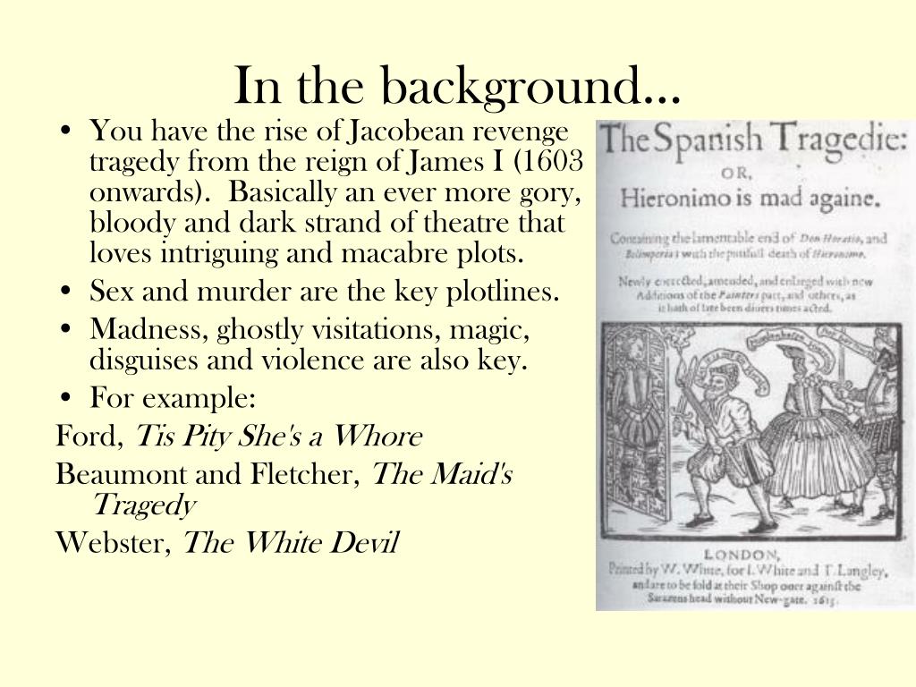 In the background… • You have the rise of Jacobean revenge tragedy from the reign of James I (1603 onwards). Basically an ever more gory, bloody and dark strand of theatre that loves intriguing and macabre plots. • Sex and murder are the key plotlines. • Madness, ghostly visitations, magic, disguises and violence are also key. • For example: Ford, Tis Pity She's a Whore Beaumont and Fletcher, The Maid's Tragedy Webster, The White Devil