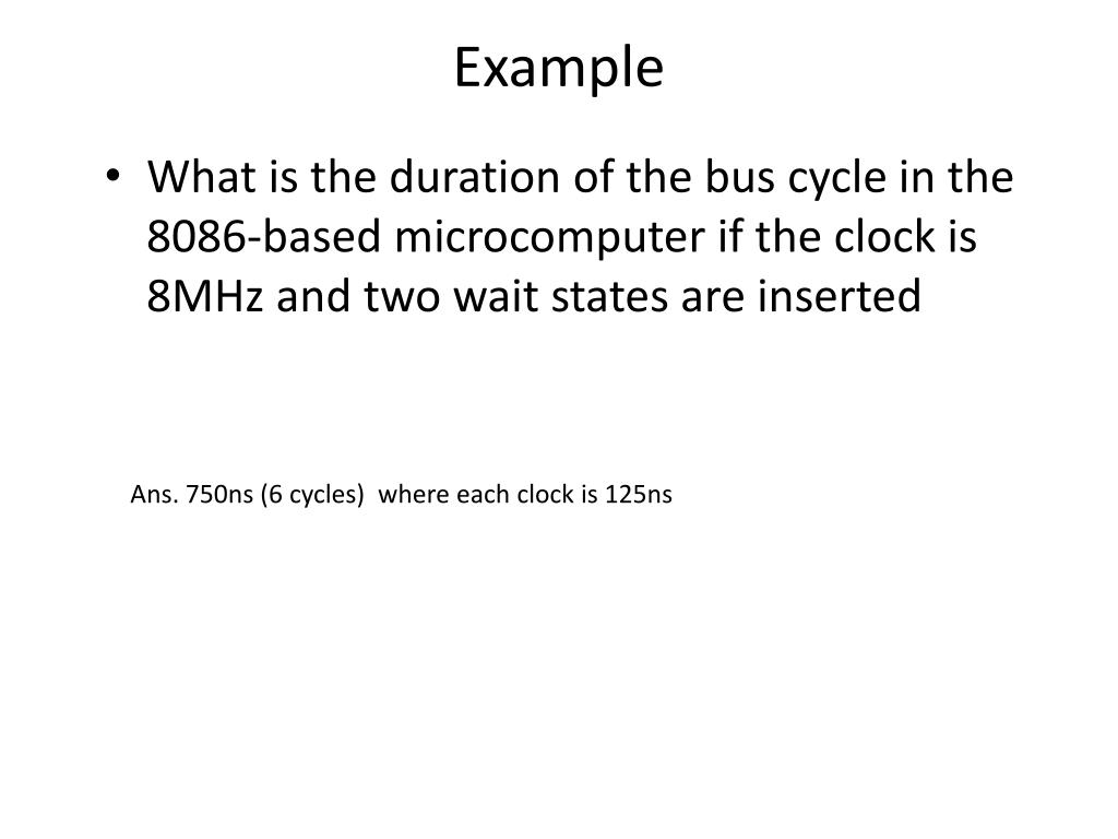 Example • What is the duration of the bus cycle in the 8086-based microcomputer if the clock is 8MHz and two wait states are inserted Ans. 750ns (6 cycles) where each clock is 125ns