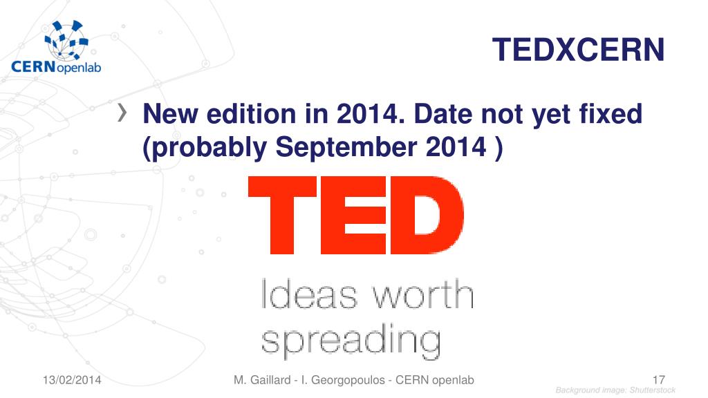 TEDXCERN • New edition in 2014. Date not yetfixed (probablySeptember 2014 ) M. Gaillard - I. Georgopoulos - CERN openlab