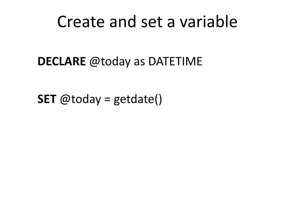 Create and set a variable DECLARE @today as DATETIME SET @today = getdate()
