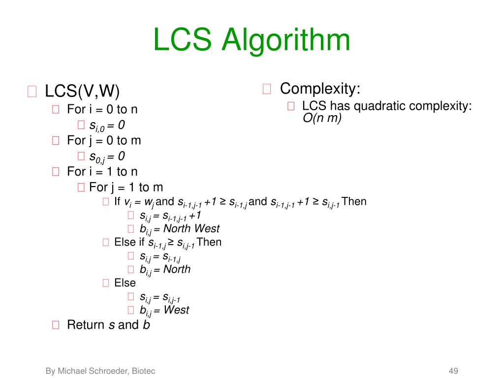 LCS Algorithm LCS(V,W) For i = 0 to n si,0 = 0 For j = 0 to m s0,j = 0 For i = 1 to n For j = 1 to m If vi = wjand si-1,j-1 +1≥si-1,j and si-1,j-1 +1≥si,j-1 Then si,j= si-1,j-1 +1 bi,j= North West Else if si-1,j ≥si,j-1 Then si,j= si-1,j bi,j= North Else si,j= si,j-1 bi,j= West Return s and b Complexity: LCS has quadratic complexity: O(n m)