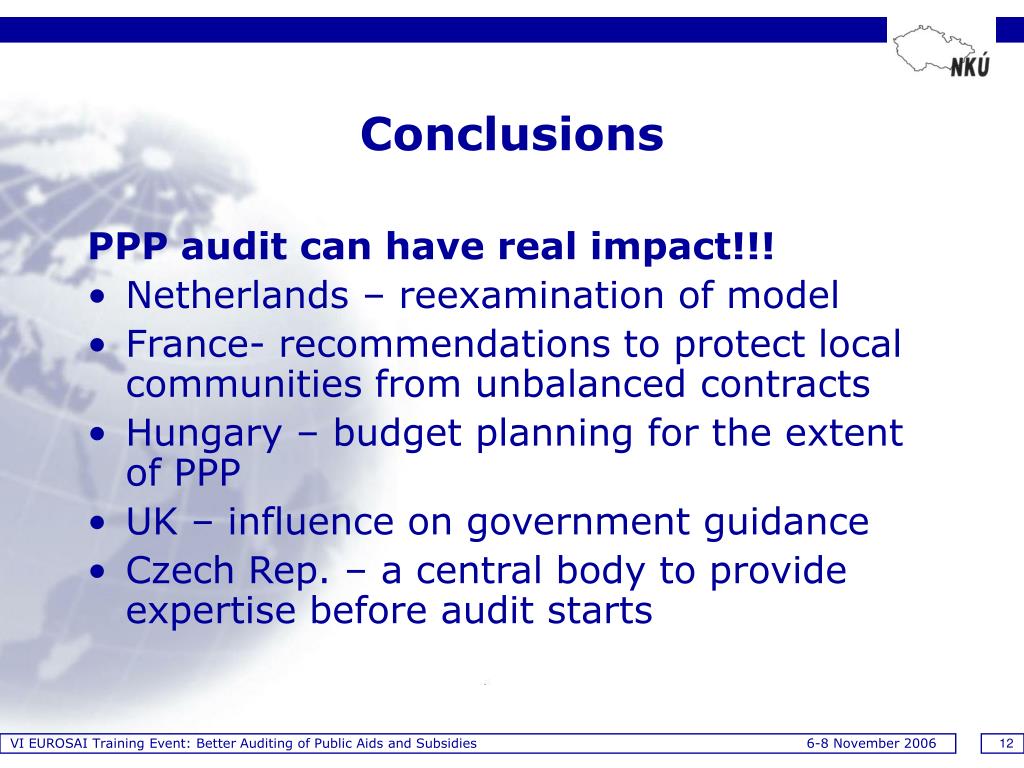 VI EUROSAI Training Event: Better Auditing of Public Aids and Subsidies 6-8 November 2006 12 Conclusions PPP audit can have real impact!!! • Netherlands – reexamination of model • France- recommendations to protect local communities from unbalanced contracts • Hungary – budget planning for the extent of PPP • UK – influence on government guidance • Czech Rep. – a central body to provide expertise before audit starts