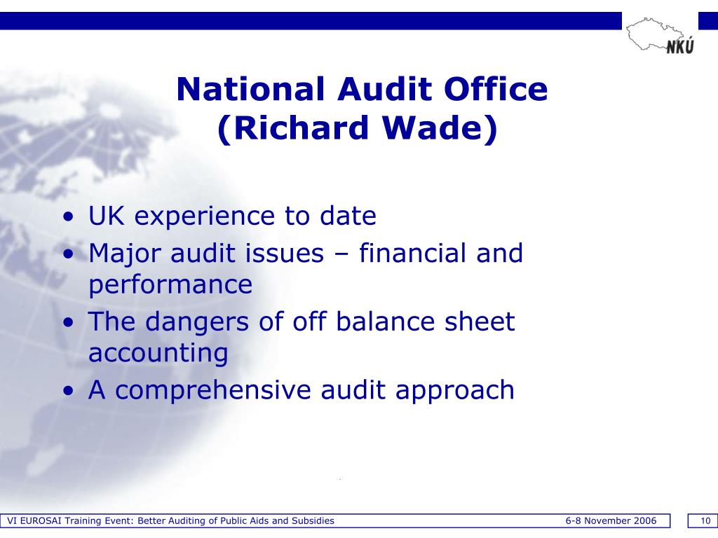 VI EUROSAI Training Event: Better Auditing of Public Aids and Subsidies 6-8 November 2006 10 National Audit Office (Richard Wade) • UK experience to date • Major audit issues – financial and performance • The dangers of off balance sheet accounting • A comprehensive audit approach