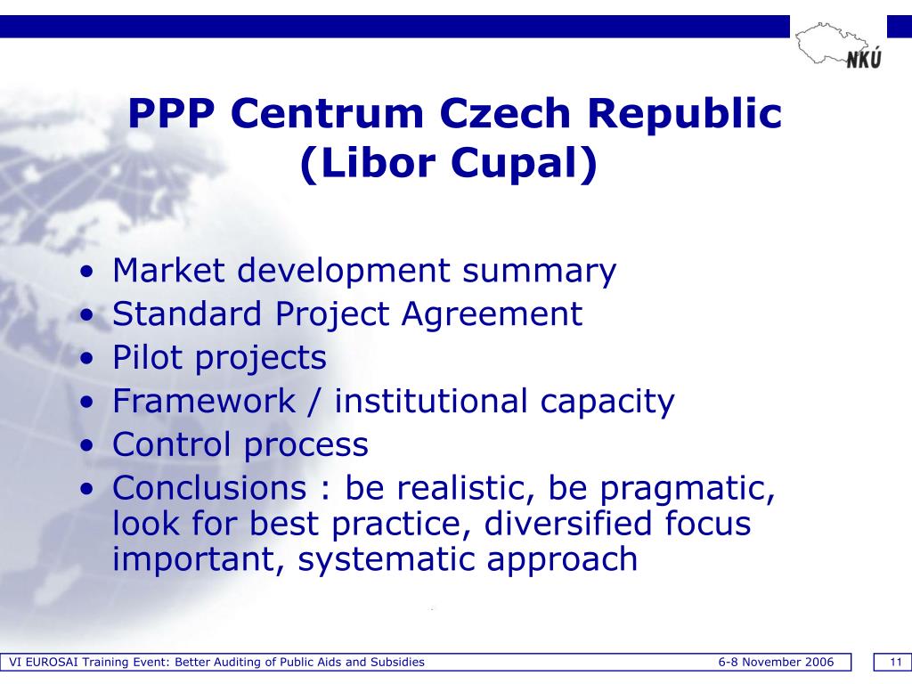 VI EUROSAI Training Event: Better Auditing of Public Aids and Subsidies 6-8 November 2006 11 PPP Centrum Czech Republic (Libor Cupal) • Market development summary • Standard Project Agreement • Pilot projects • Framework / institutional capacity • Control process • Conclusions : be realistic, be pragmatic, look for best practice, diversified focus important, systematic approach