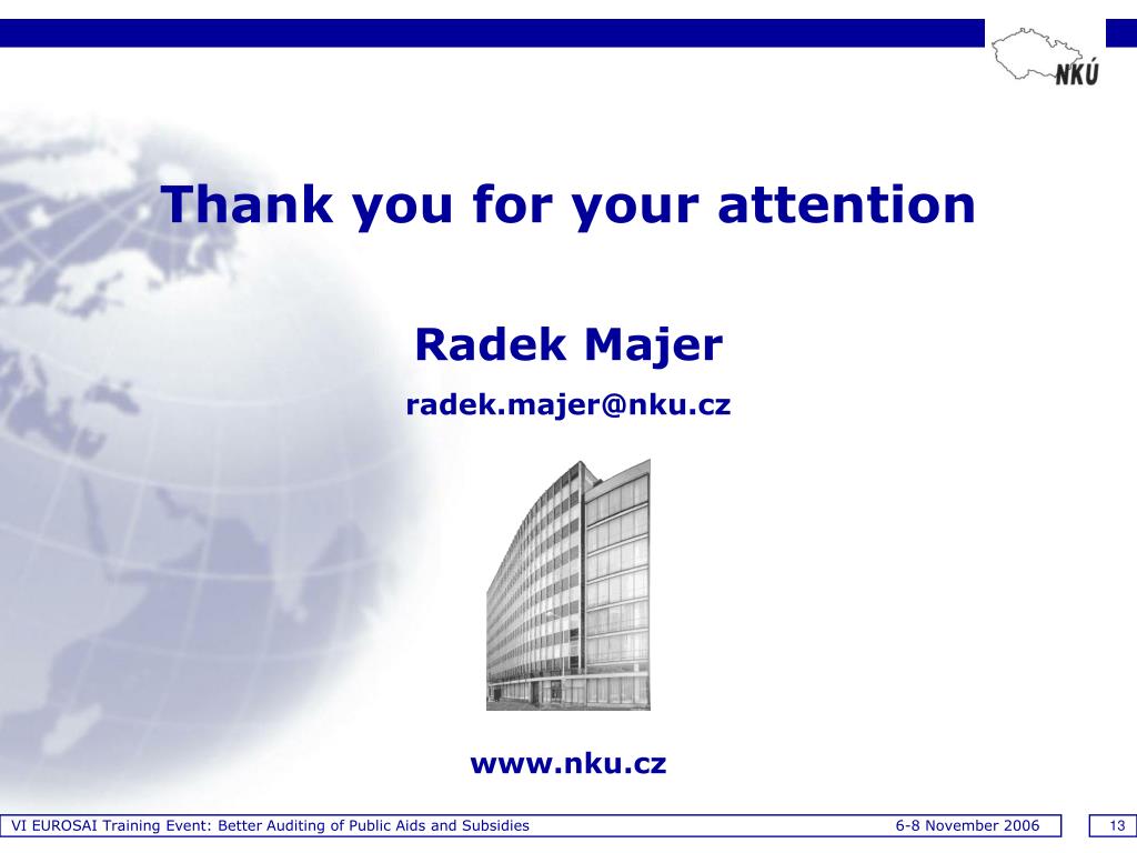 VI EUROSAI Training Event: Better Auditing of Public Aids and Subsidies 6-8 November 2006 13 Thank you for your attention Radek Majer radek.majer@nku.cz www.nku.cz