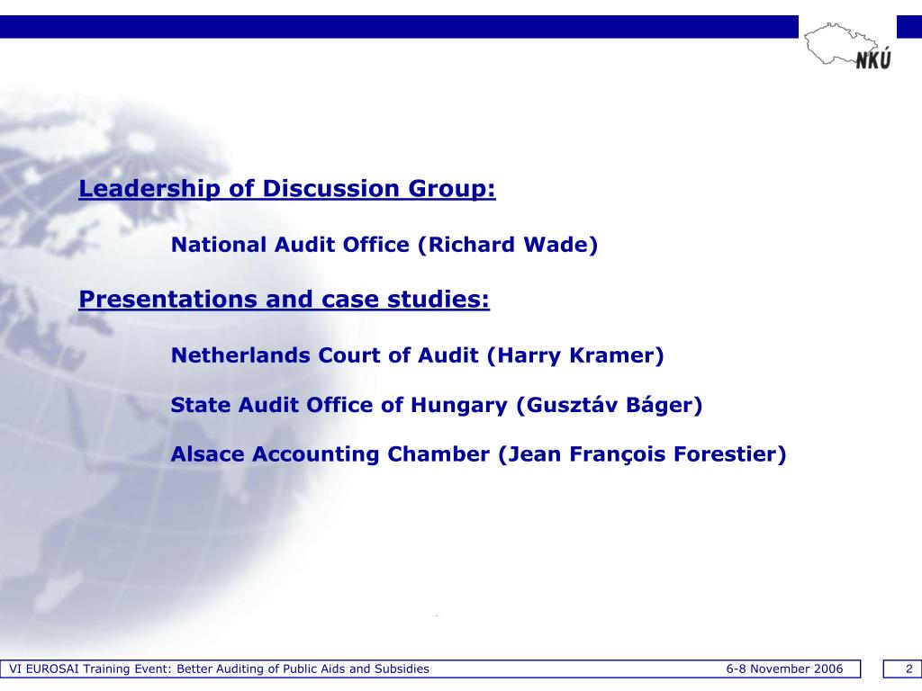 VI EUROSAI Training Event: Better Auditing of Public Aids and Subsidies 6-8 November 2006 2 Leadership of Discussion Group:National Audit Office (Richard Wade)Presentations and case studies:Netherlands Court of Audit (Harry Kramer) State Audit Office of Hungary (Gusztáv Báger)Alsace Accounting Chamber (Jean François Forestier)
