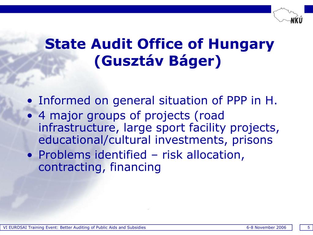 VI EUROSAI Training Event: Better Auditing of Public Aids and Subsidies 6-8 November 2006 5 State Audit Office of Hungary (Gusztáv Báger) • Informed on general situation of PPP in H. • 4 major groups of projects (road infrastructure, large sport facility projects, educational/cultural investments, prisons • Problems identified – risk allocation, contracting, financing