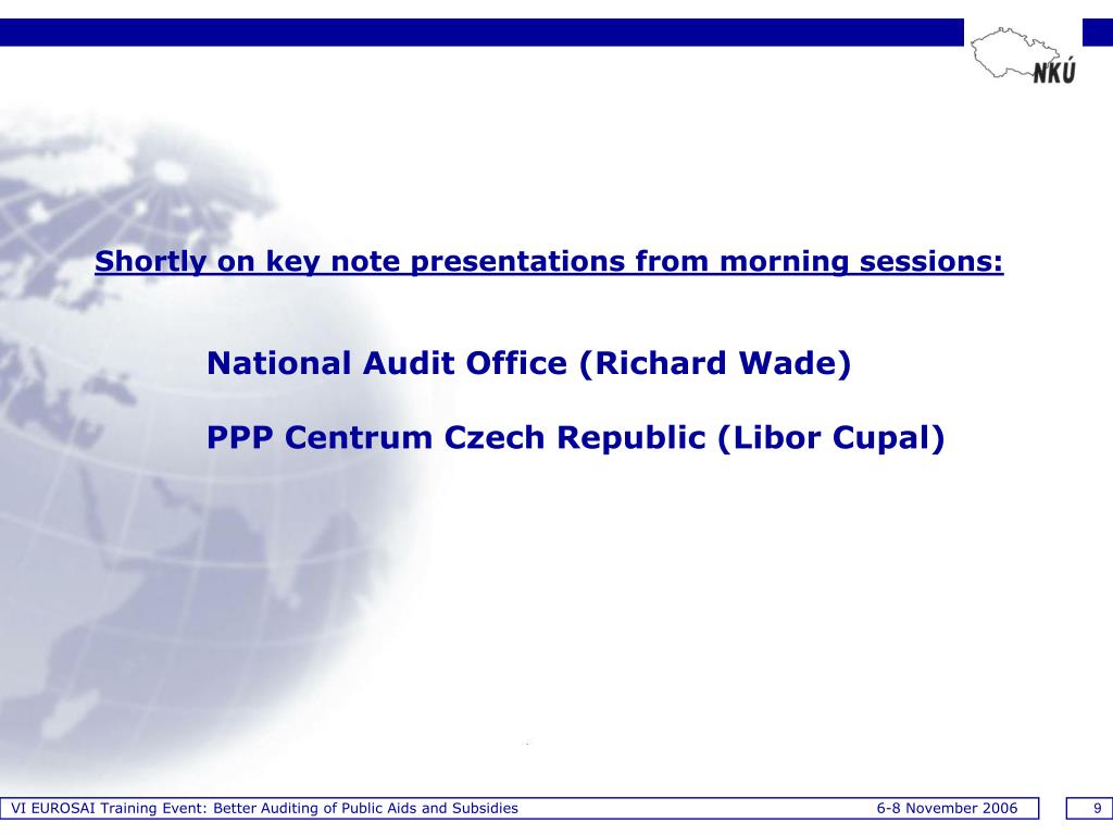 VI EUROSAI Training Event: Better Auditing of Public Aids and Subsidies 6-8 November 2006 9 Shortly on key note presentations from morning sessions:National Audit Office (Richard Wade) PPP Centrum Czech Republic (Libor Cupal)
