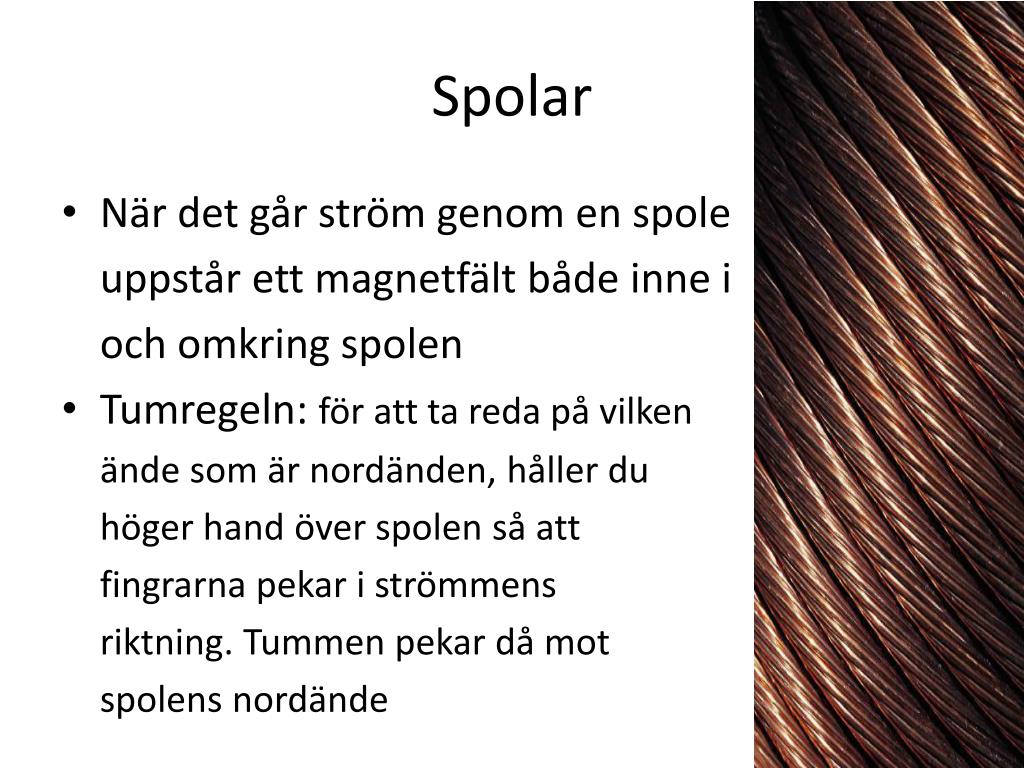 Spolar • När det går ström genom en spole uppstår ett magnetfält både inne i och omkring spolen • Tumregeln: för att ta reda på vilken ände som är nordänden, håller du höger hand över spolen så att fingrarna pekar i strömmens riktning. Tummen pekar då mot spolens nordände