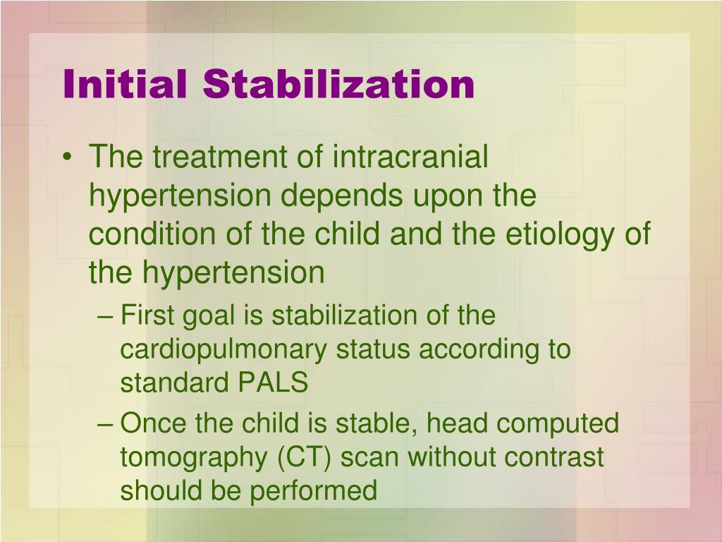 Initial Stabilization • The treatment of intracranial hypertension depends upon the condition of the child and the etiology of the hypertension • First goal is stabilization of the cardiopulmonary status according to standard PALS • Once the child is stable, head computed tomography (CT) scan without contrast should be performed