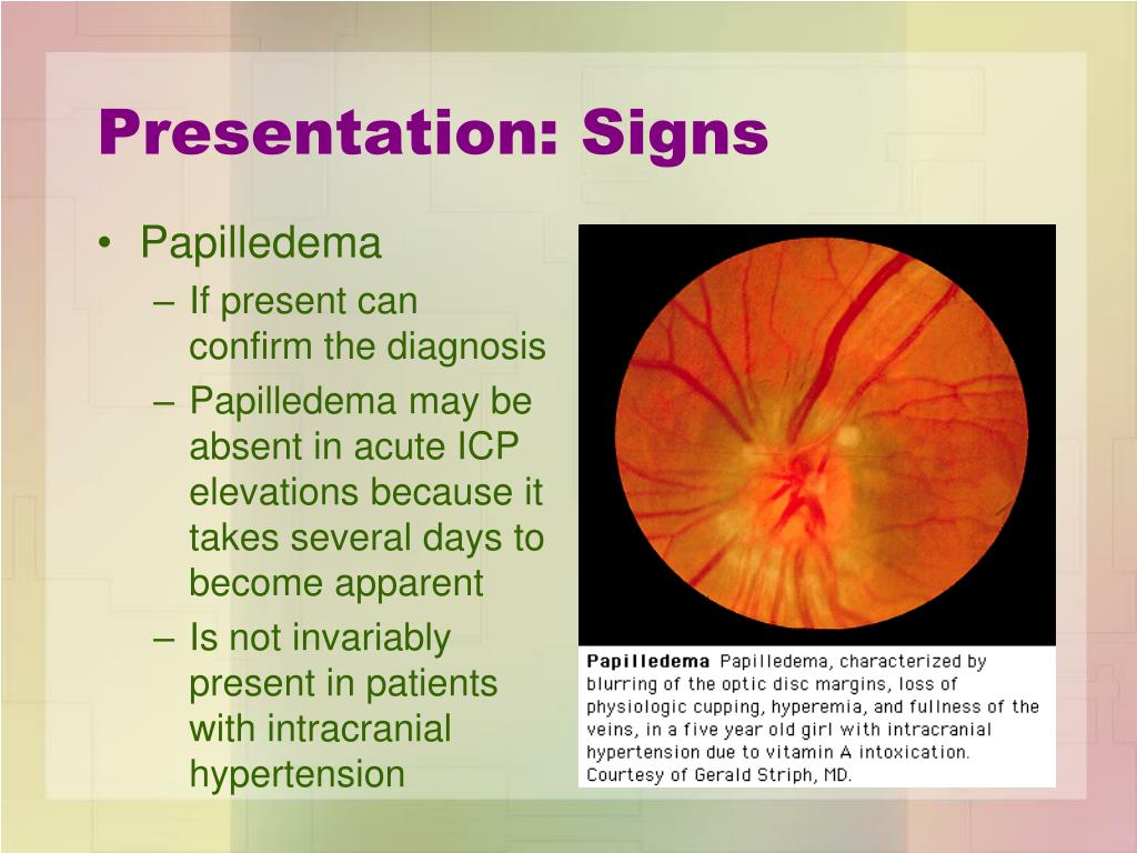 Presentation: Signs • Papilledema • If present can confirm the diagnosis • Papilledema may be absent in acute ICP elevations because it takes several days to become apparent • Is not invariably present in patients with intracranial hypertension