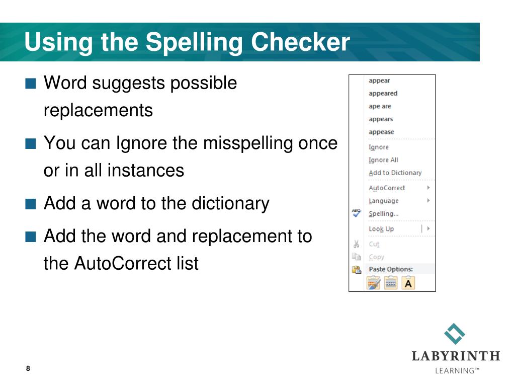 Using the Spelling Checker • Word suggests possible replacements • You can Ignore the misspelling once or in all instances • Add a word to the dictionary • Add the word and replacement to the AutoCorrect list