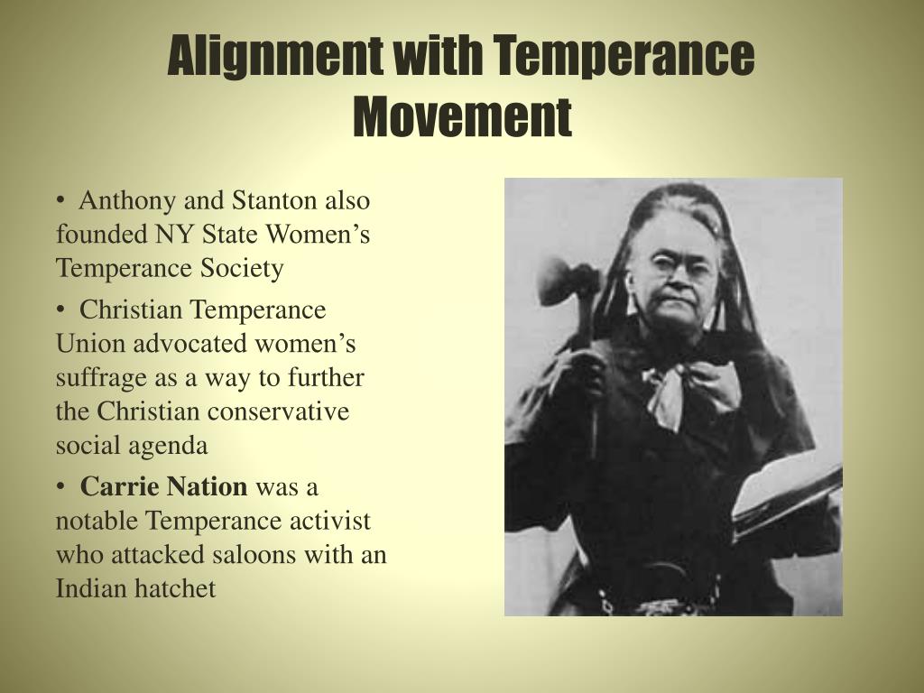 Alignment with Temperance Movement • Anthony and Stanton also founded NY State Women’s Temperance Society • Christian Temperance Union advocated women’s suffrage as a way to further the Christian conservative social agenda • Carrie Nation was a notable Temperance activist who attacked saloons with an Indian hatchet