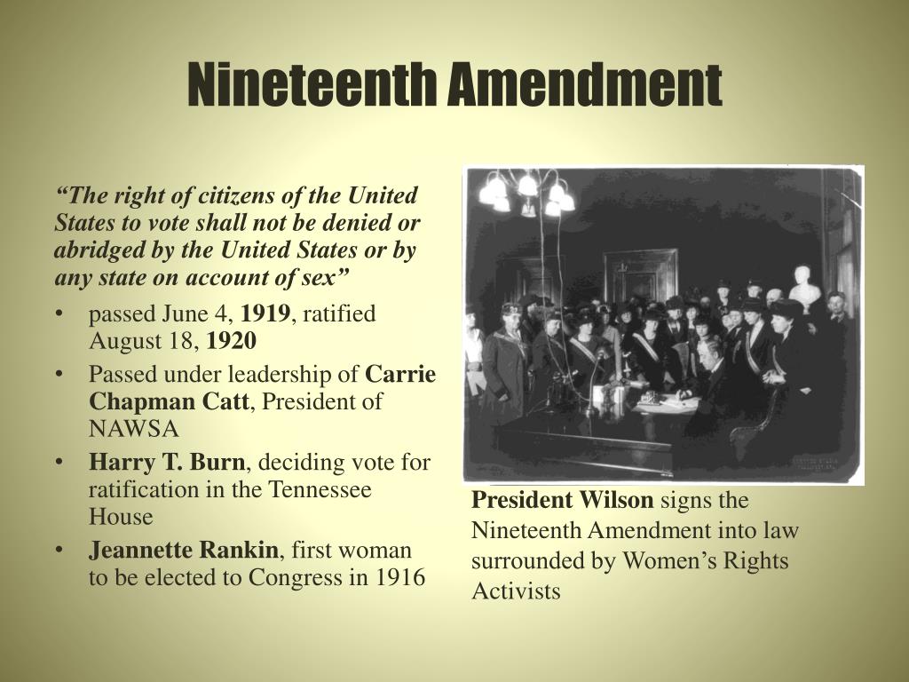 Nineteenth Amendment “The right of citizens of the United States to vote shall not be denied or abridged by the United States or by any state on account of sex” President Wilson signs the Nineteenth Amendment into law surrounded by Women’s Rights Activists • passed June 4, 1919, ratified August 18, 1920 • Passed under leadership of Carrie Chapman Catt, President of NAWSA • Harry T. Burn, deciding vote for ratification in the Tennessee House • Jeannette Rankin, first woman to be elected to Congress in 1916