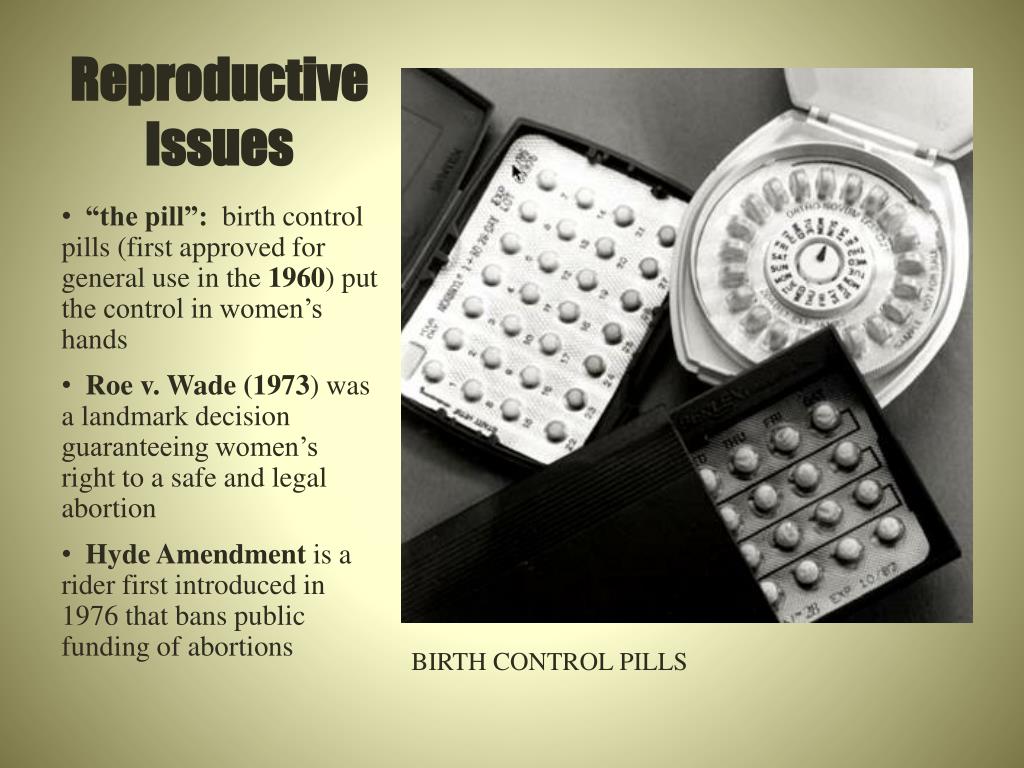 Reproductive Issues “the pill”: birth control pills (first approved for general use in the 1960) put the control in women’s hands Roe v. Wade (1973) was a landmark decision guaranteeing women’s right to a safe and legal abortion Hyde Amendment is a rider first introduced in 1976 that bans public funding of abortions BIRTH CONTROL PILLS