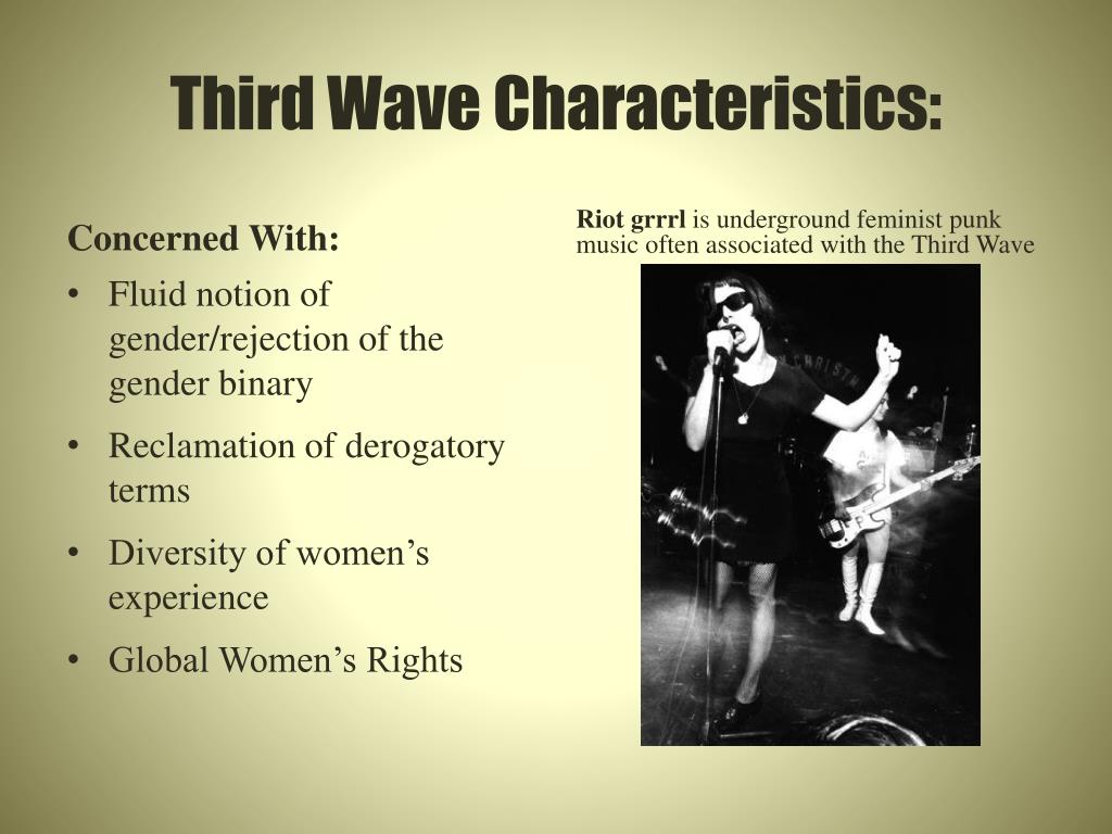 Third Wave Characteristics: Concerned With: Riot grrrlis underground feminist punk music often associated with the Third Wave • Fluid notion of gender/rejection of the gender binary • Reclamation of derogatory terms • Diversity of women’s experience • Global Women’s Rights