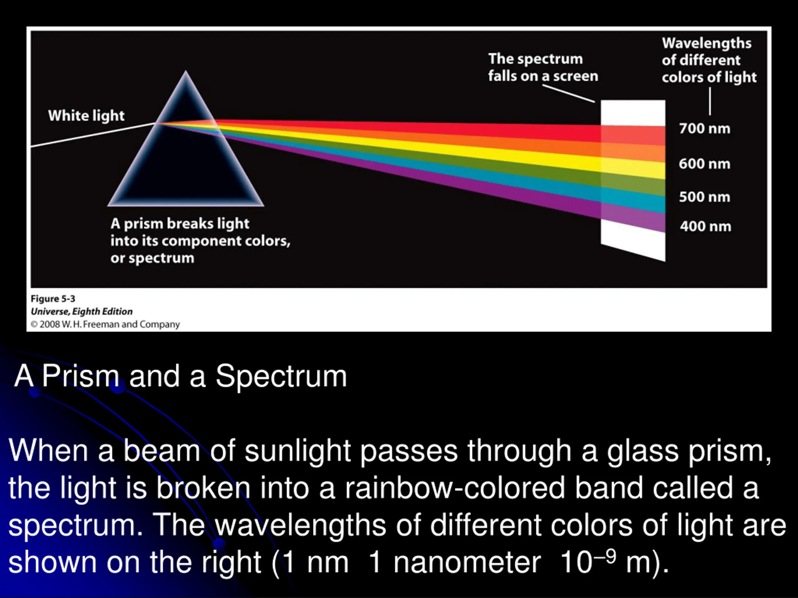A Prism and a Spectrum When a beam of sunlight passes through a glass prism, the light is broken into a rainbow-colored band called a spectrum. The wavelengths of different colors of light are shown on the right (1 nm 1 nanometer 10–9m).