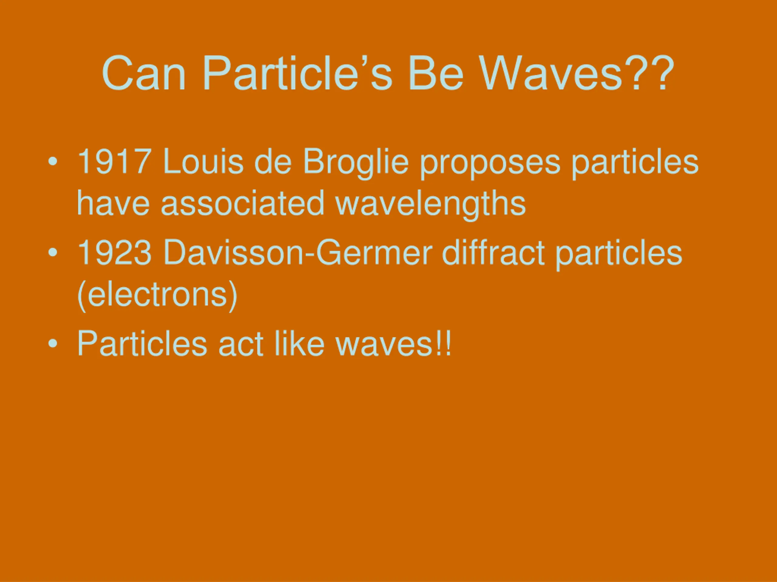 Can Particle’s Be Waves?? • 1917 Louis de Broglie proposes particles have associated wavelengths • 1923 Davisson-Germer diffract particles (electrons) • Particles act like waves!!