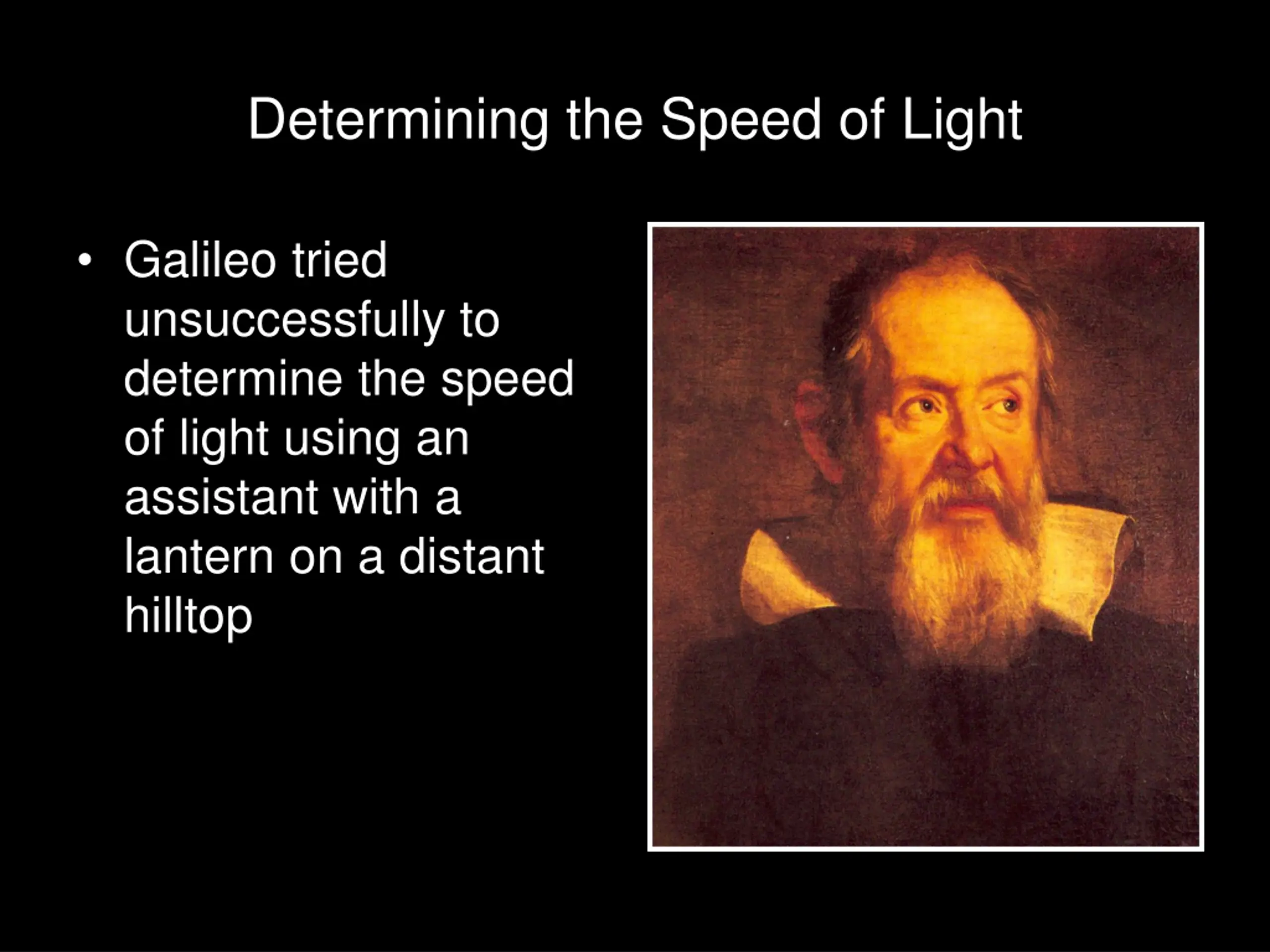Determining the Speed of Light • Galileo tried unsuccessfully to determine the speed of light using an assistant with a lantern on a distant hilltop