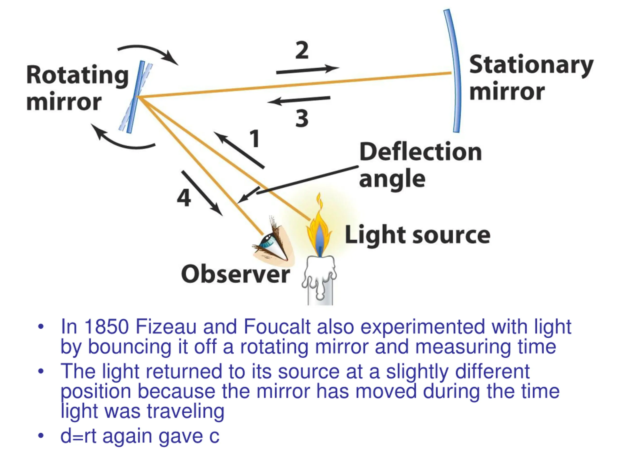 • In 1850 Fizeau and Foucalt also experimented with light by bouncing it off a rotating mirror and measuring time • The light returned to its source at a slightly different position because the mirror has moved during the time light was traveling • d=rt again gave c