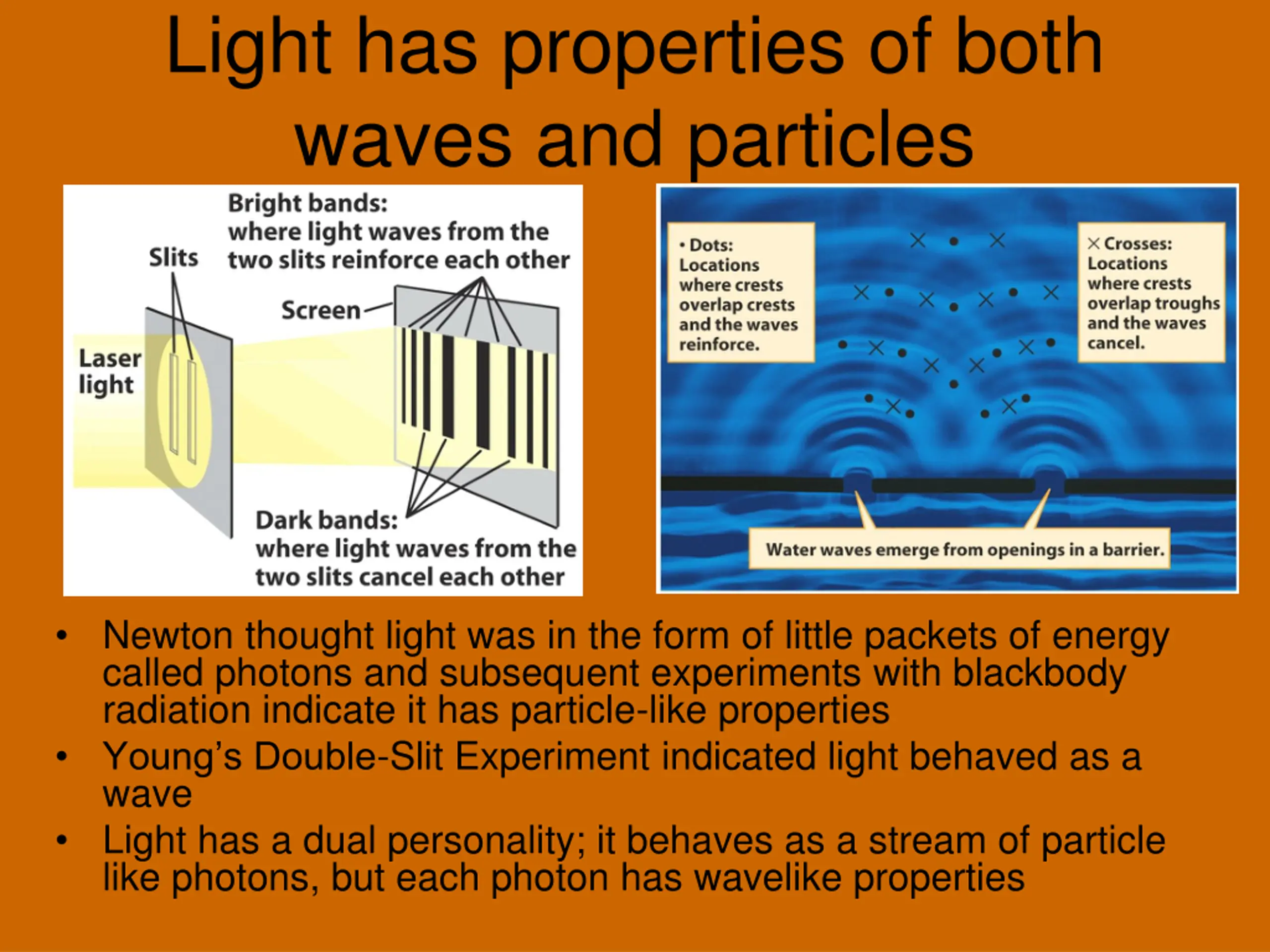 Light has properties of both waves and particles • Newton thought light was in the form of little packets of energy called photons and subsequent experiments with blackbody radiation indicate it has particle-like properties • Young’s Double-Slit Experiment indicated light behaved as a wave • Light has a dual personality; it behaves as a stream of particle like photons, but each photon has wavelike properties