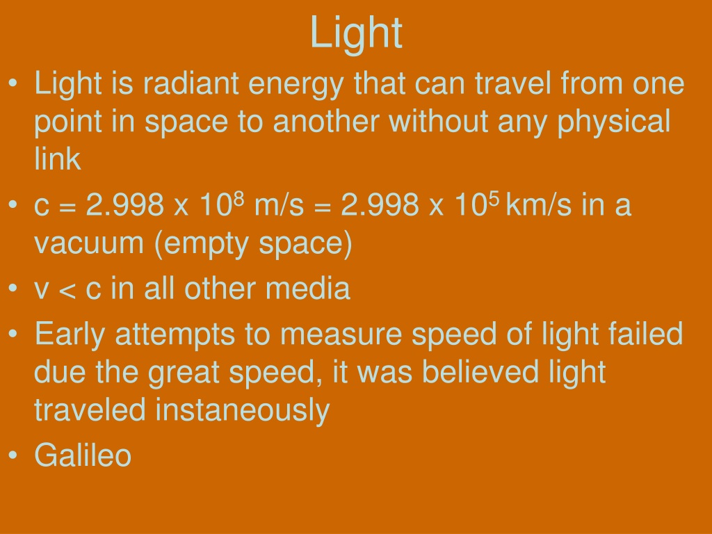 Light • Light is radiant energy that can travel from one point in space to another without any physical link • c = 2.998 x 108m/s = 2.998 x 105km/s in a vacuum (empty space) • v < c in all other media • Early attempts to measure speed of light failed due the great speed, it was believed light traveled instaneously • Galileo