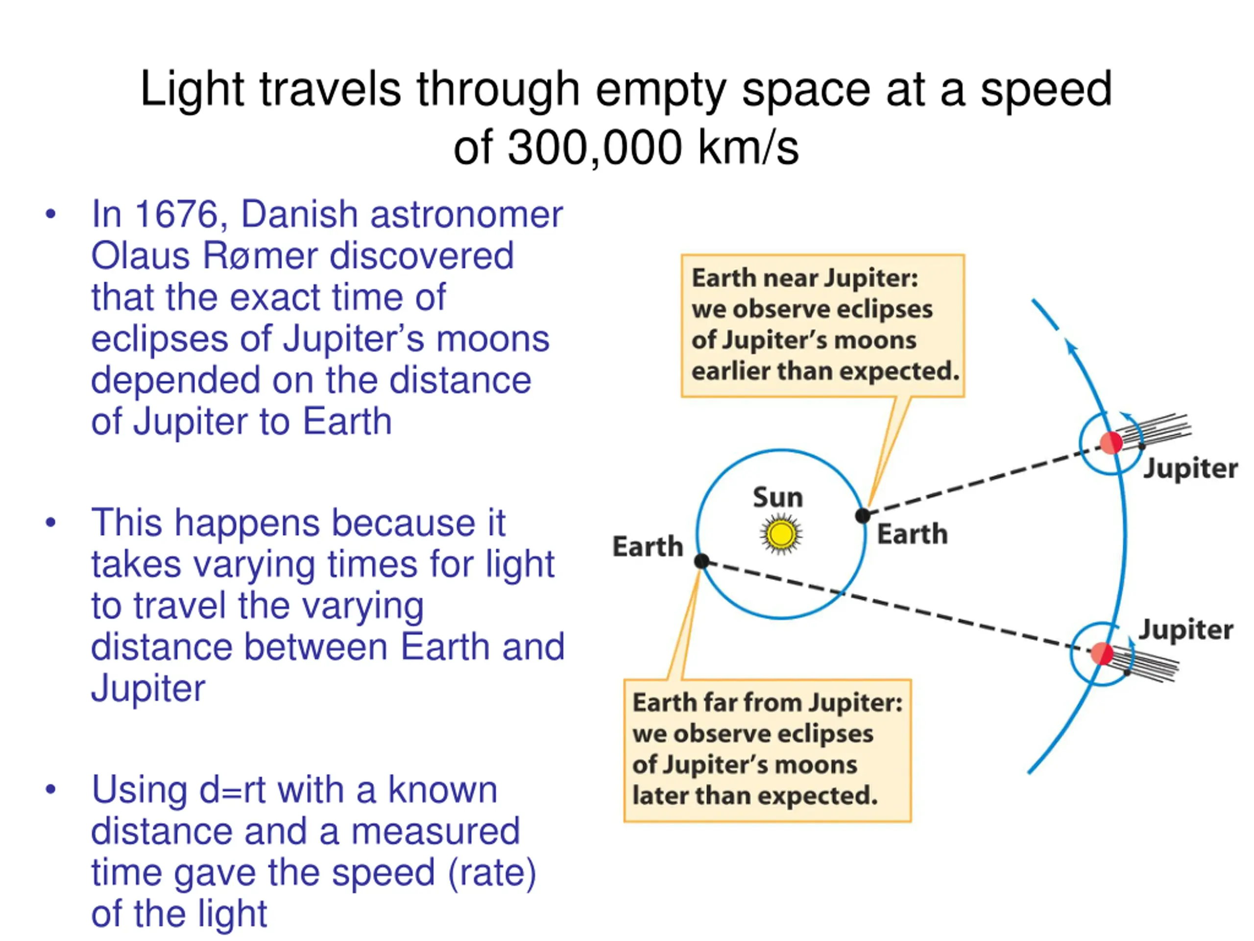 Light travels through empty space at a speed of 300,000 km/s • In 1676, Danish astronomer Olaus Rømer discovered that the exact time of eclipses of Jupiter’s moons depended on the distance of Jupiter to Earth • This happens because it takes varying times for light to travel the varying distance between Earth and Jupiter • Using d=rt with a known distance and a measured time gave the speed (rate) of the light