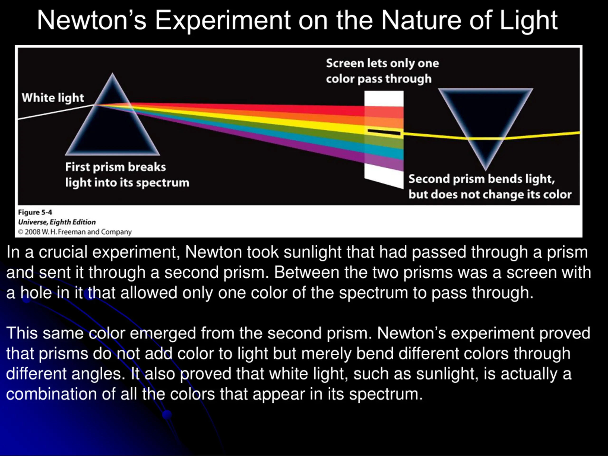 Newton’s Experiment on the Nature of Light In a crucial experiment, Newton took sunlight that had passed through a prism and sent it through a second prism. Between the two prisms was a screen with a hole in it that allowed only one color of the spectrum to pass through. This same color emerged from the second prism. Newton’s experiment proved that prisms do not add color to light but merely bend different colors through different angles. It also proved that white light, such as sunlight, is actually a combination of all the colors that appear in its spectrum.