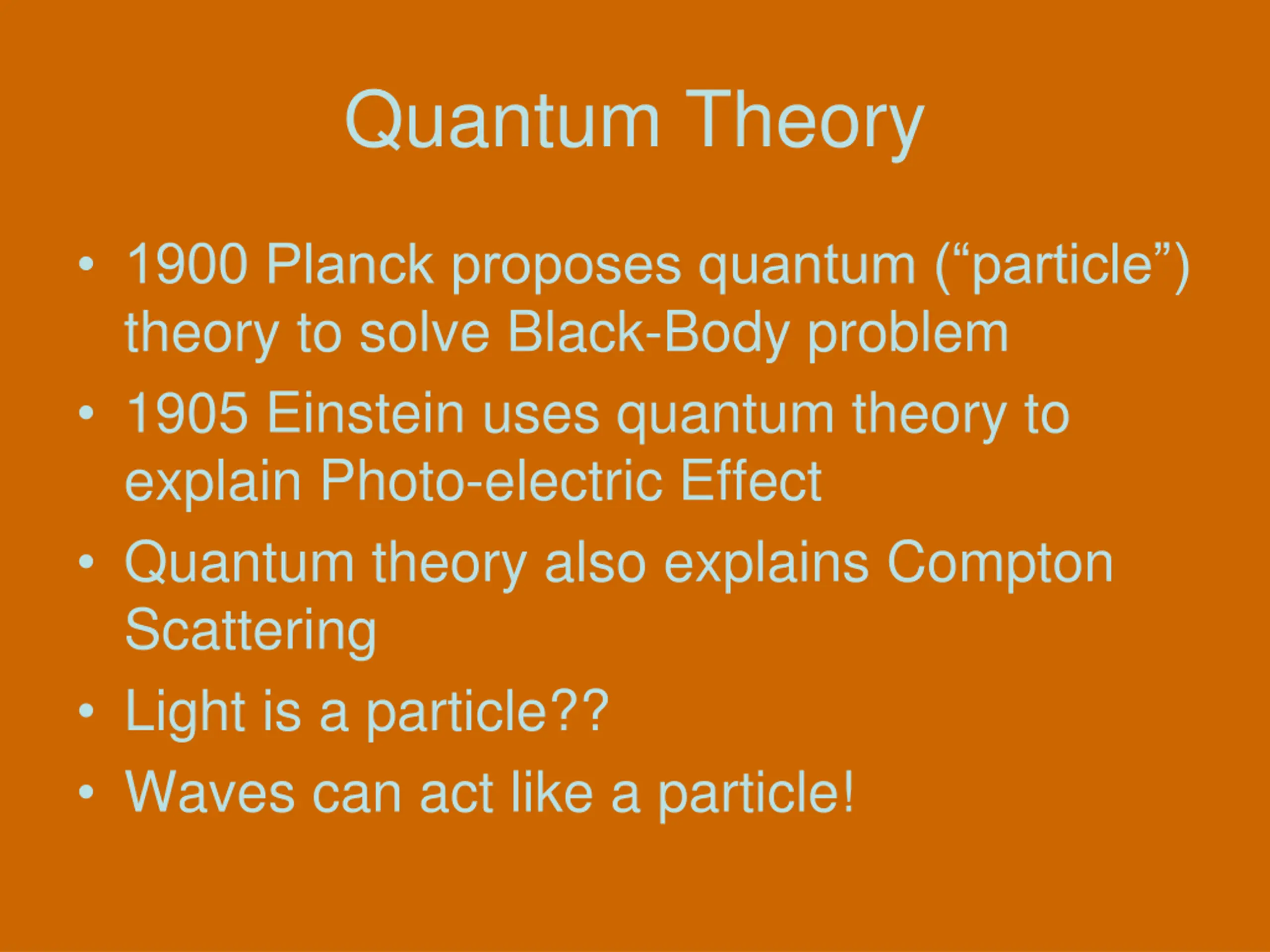 Quantum Theory • 1900 Planck proposes quantum (“particle”) theory to solve Black-Body problem • 1905 Einstein uses quantum theory to explain Photo-electric Effect • Quantum theory also explains Compton Scattering • Light is a particle?? • Waves can act like a particle!