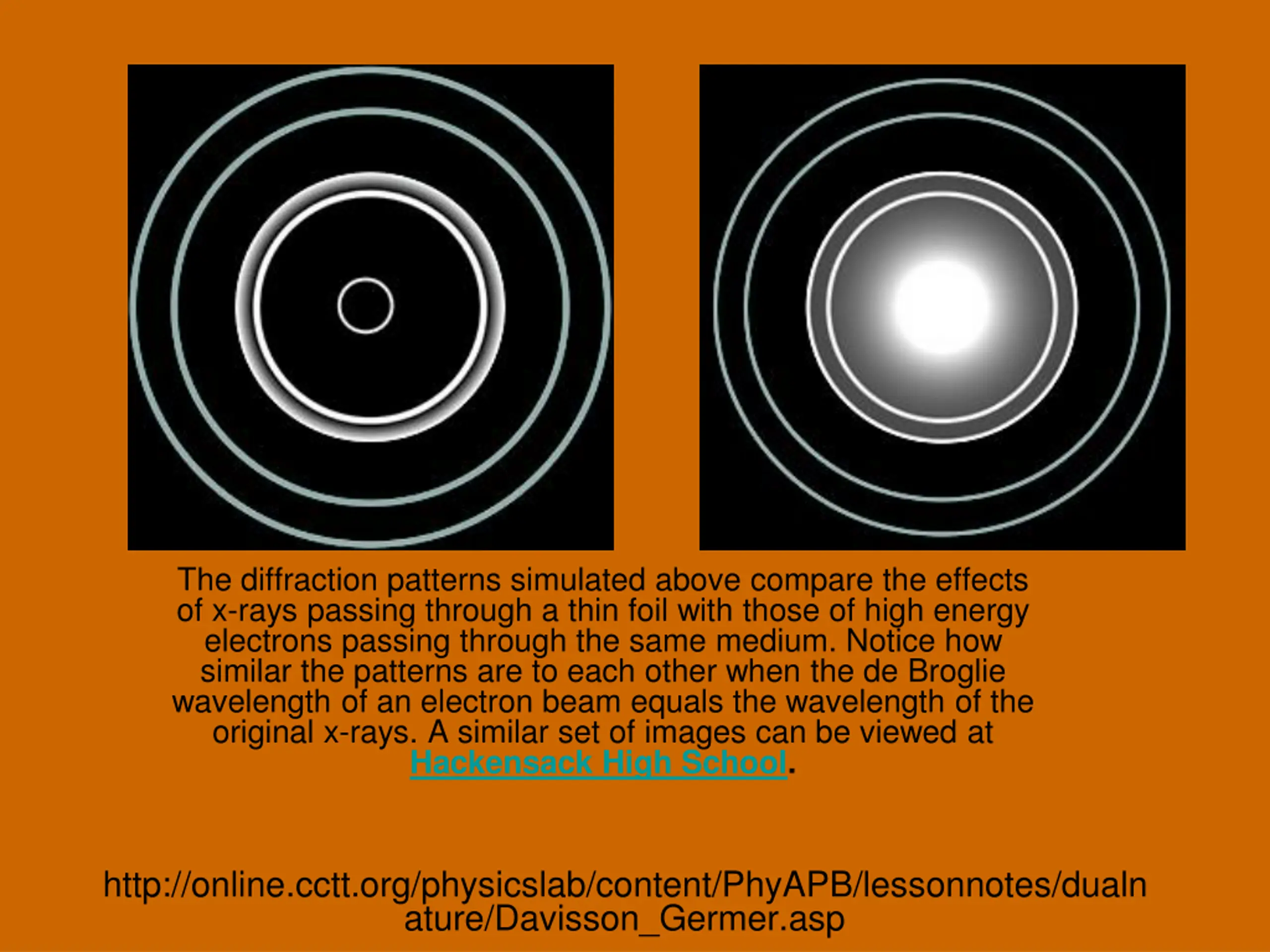 The diffraction patterns simulated above compare the effects of x-rays passing through a thin foil with those of high energy electrons passing through the same medium. Notice how similar the patterns are to each other when the de Broglie wavelength of an electron beam equals the wavelength of the original x-rays. A similar set of images can be viewed at Hackensack High School. http://online.cctt.org/physicslab/content/PhyAPB/lessonnotes/dualn ature/Davisson_Germer.asp
