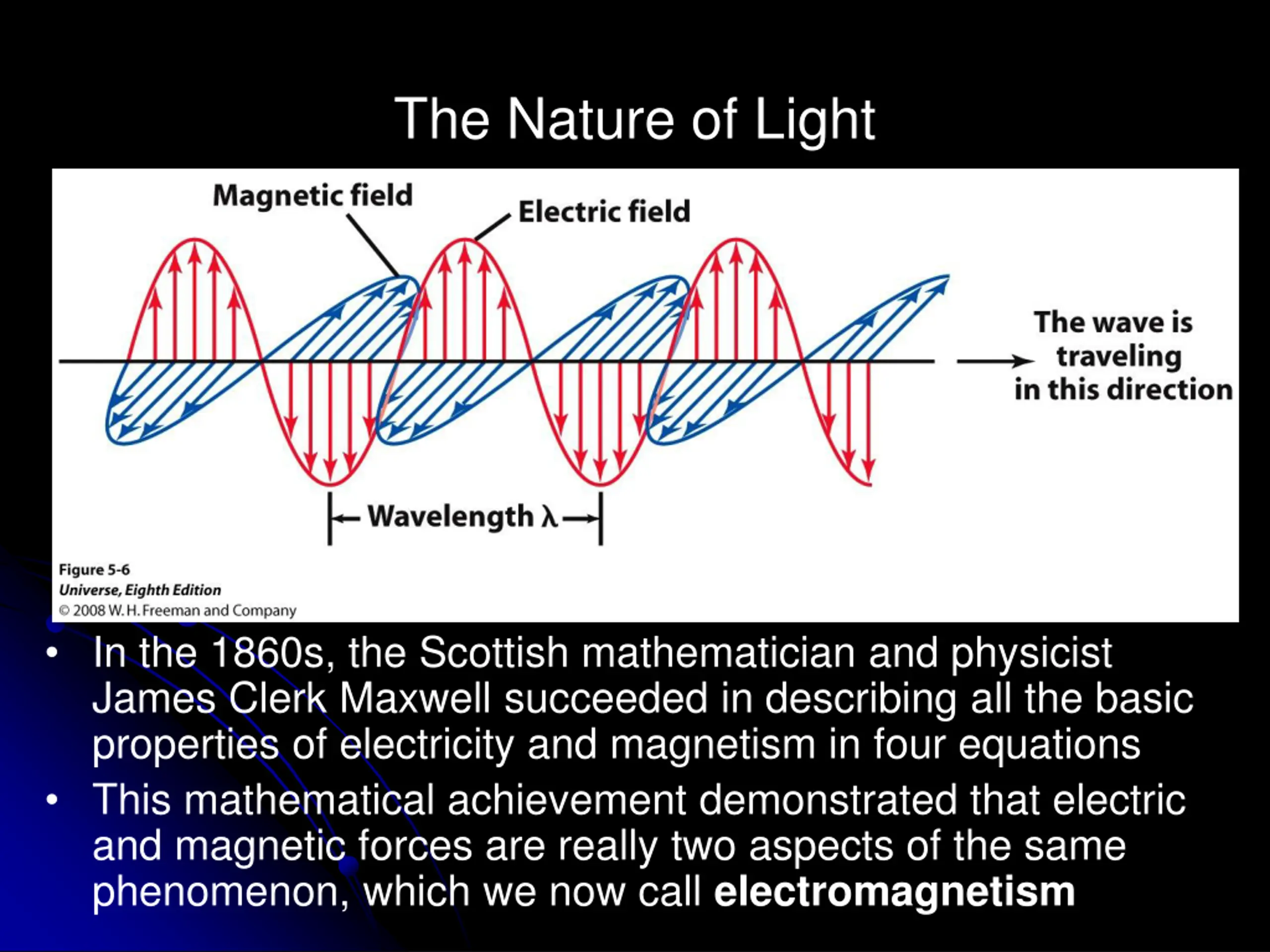 The Nature of Light • In the 1860s, the Scottish mathematician and physicist James Clerk Maxwell succeeded in describing all the basic properties of electricity and magnetism in four equations • This mathematical achievement demonstrated that electric and magnetic forces are really two aspects of the same phenomenon, which we now call electromagnetism