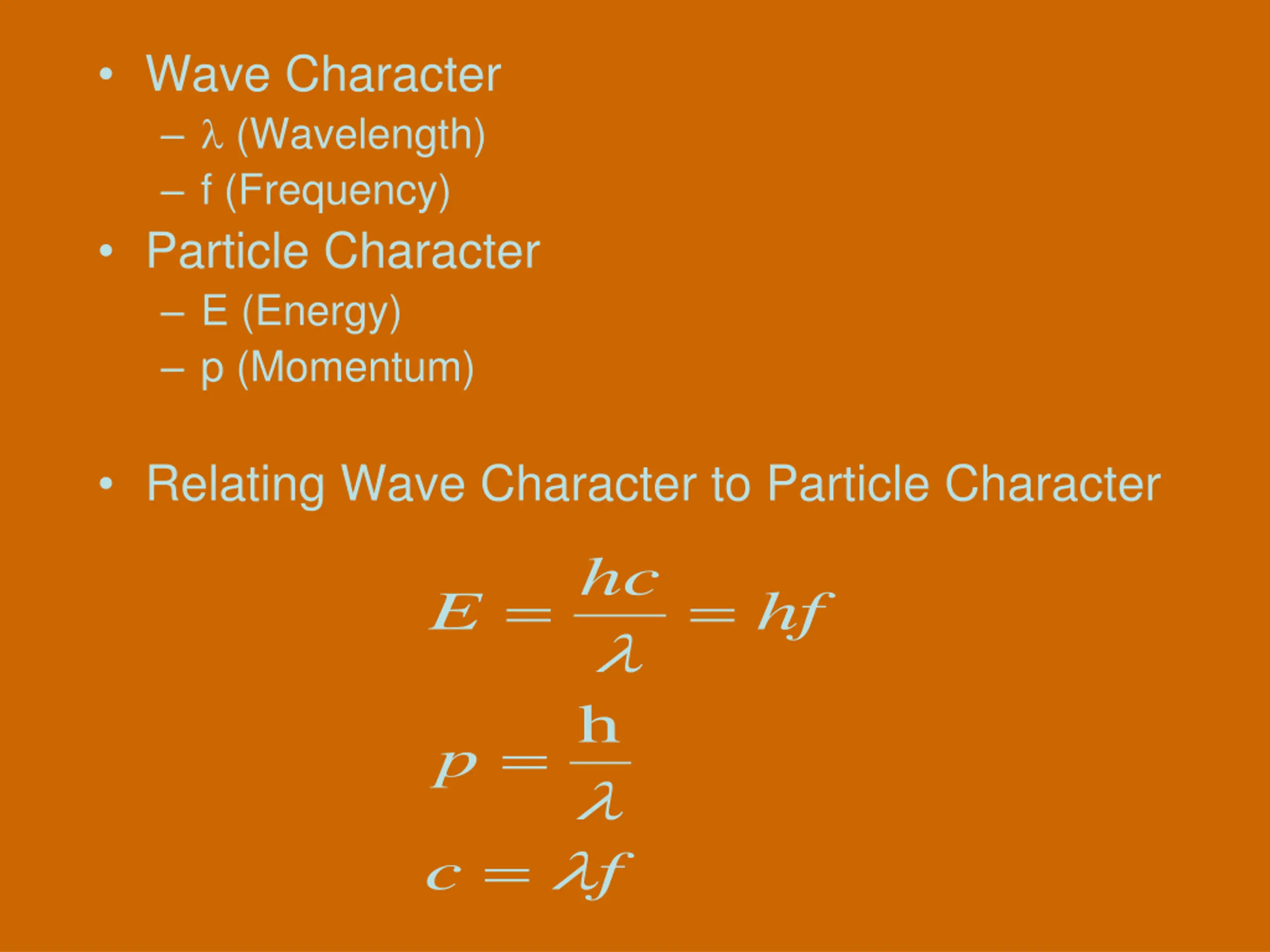 • Wave Character – (Wavelength) – f (Frequency) • Particle Character – E (Energy) – p (Momentum) • Relating Wave Character to Particle Character hc E h hf p c f