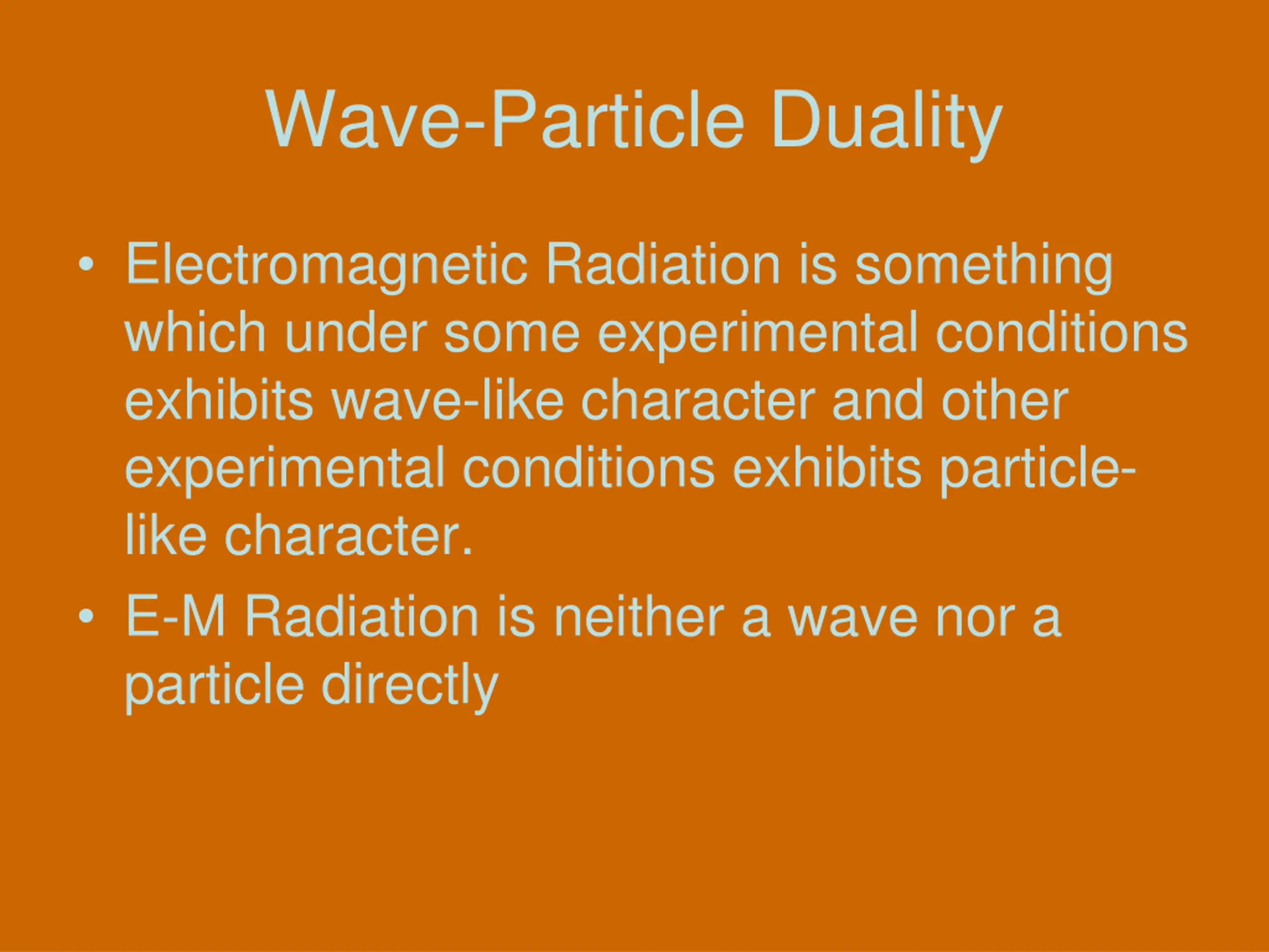Wave-Particle Duality • Electromagnetic Radiation is something which under some experimental conditions exhibits wave-like character and other experimental conditions exhibits particle- like character. • E-M Radiation is neither a wave nor a particle directly