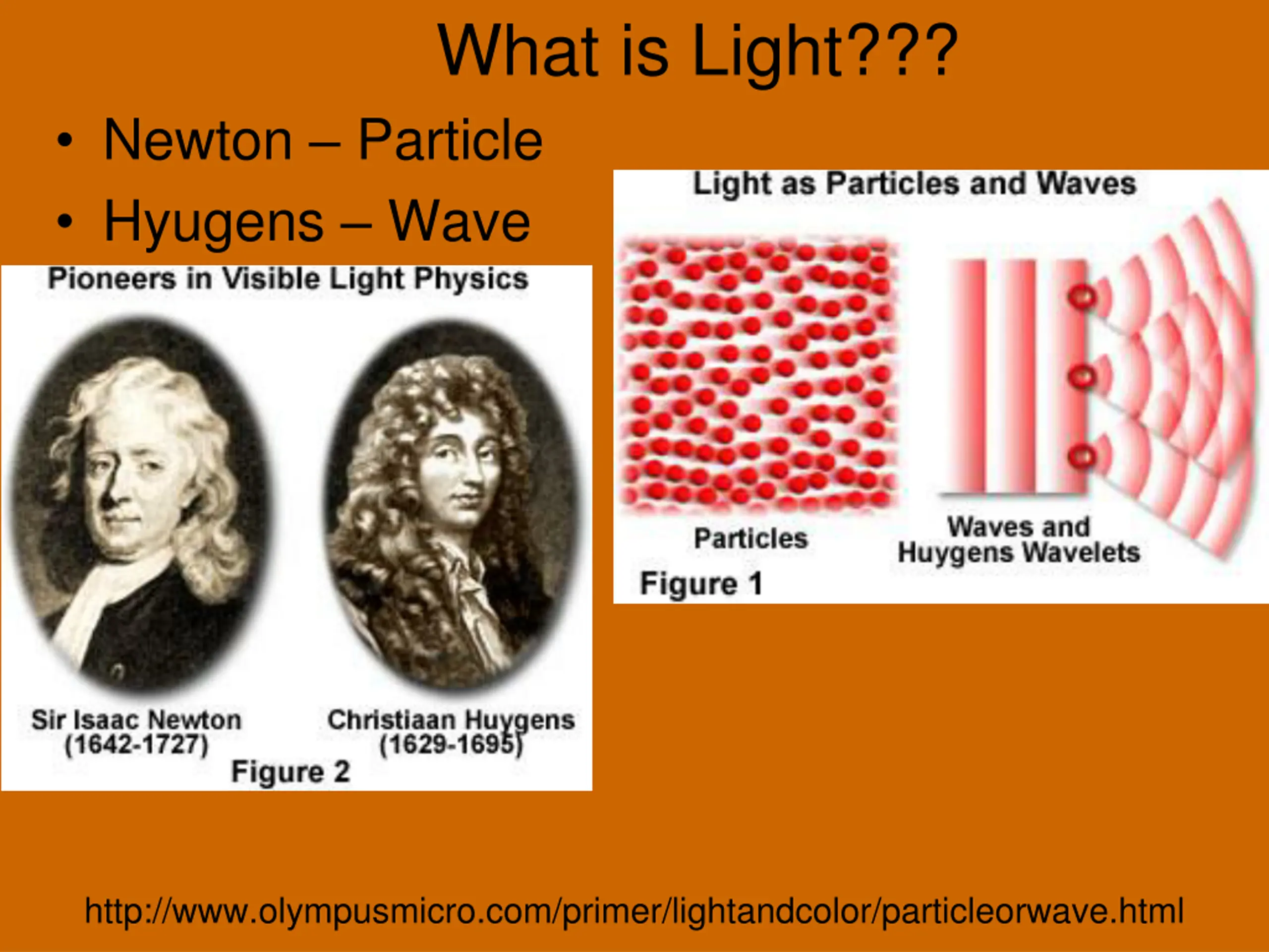 What is Light??? • Newton – Particle • Hyugens – Wave http://www.olympusmicro.com/primer/lightandcolor/particleorwave.html
